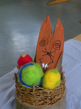 Liebe Eltern der Klasse 3, Wir wünschen euch frohe Oster und viel Glück im Jahr. Wenn ihr euch wundert, was für ein Pommes frites das auf dem Bild ist… das ist das Pommesei Fridolin mit Gesicht. Wir haben nämlich Ostereier gefilzt und mit Kurt Fischer Osternester gemacht. Wir haben mit Nadeln gefilzt. Dabei sind 38 von 40 Nadeln abgebrochen. Max hat sich zweimal in den Finger gestochen. Und wir haben Osterhasen gemacht. Dabei hatten wir viel Spaß. Euer Matti Das Osterfest