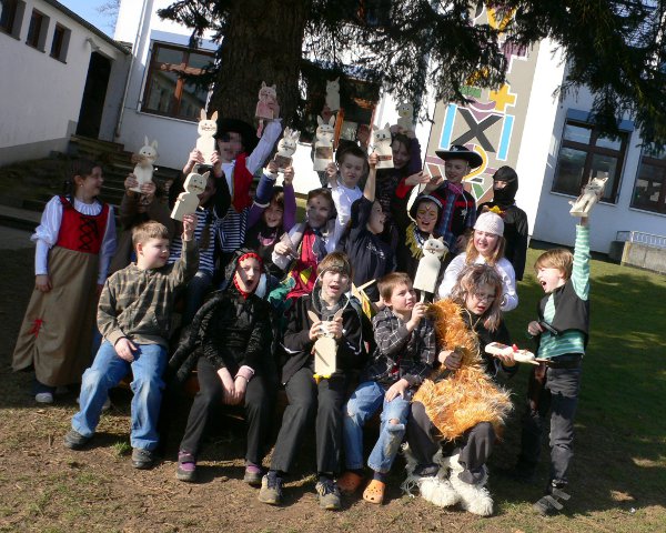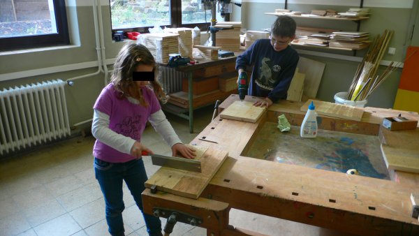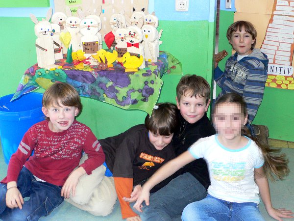 Wir, die Klasse 3, haben Holzhasen, Katzen, Enten und Eulen ausgesägt.