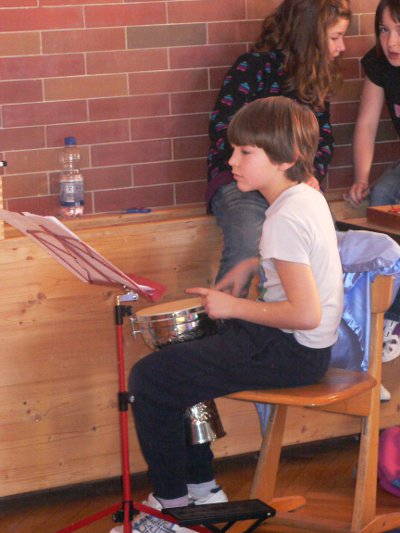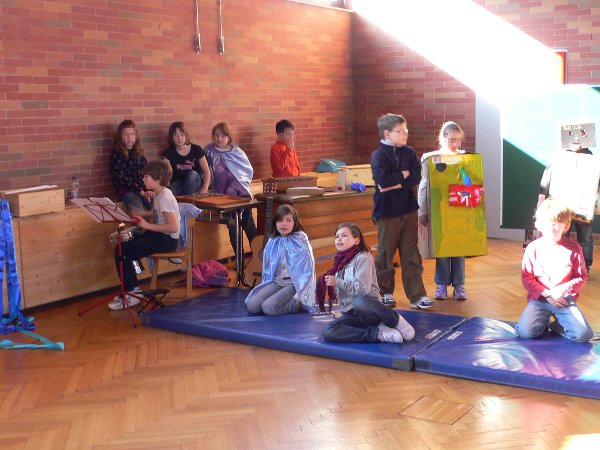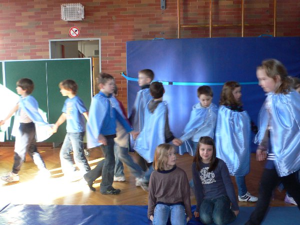 Jule schreibt: Wir haben schon viele Musikstücke geprobt und viele Tänze zum Thema getanzt. Ein paar Kinder sind Wassertropfen, andere spielen die Instrumente und wieder andere spielen freundliche Leute am Fluss. Wir haben ein Bühnenbild, Wellen und viele andere Sachen. Zu dem Stück von Smetana "Die Moldau" tanzen wir und bewegen uns wie eine Quelle.