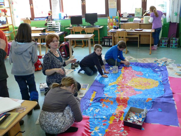 Mit ordentlich Kleister und Papierfetzen kleben wir unser Bühnenbild