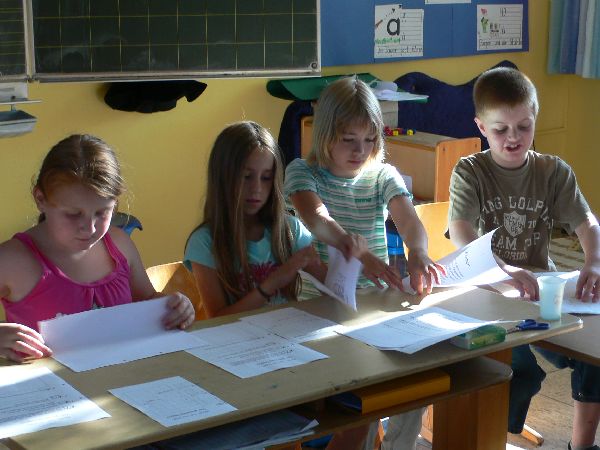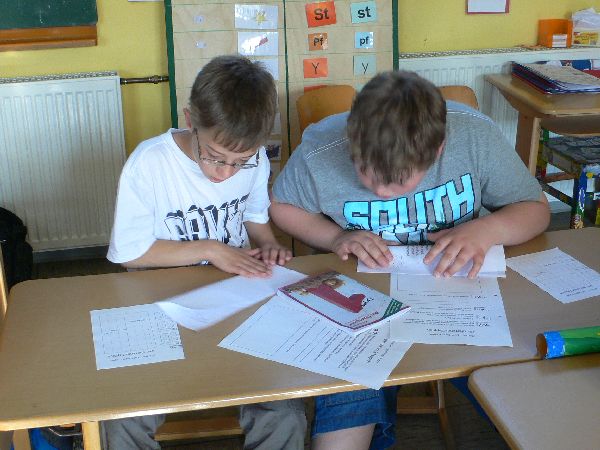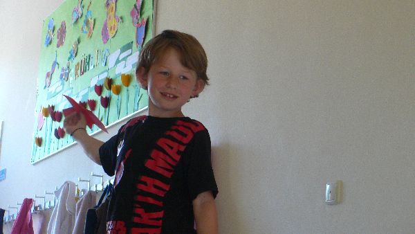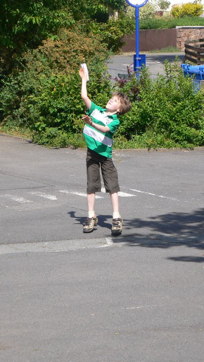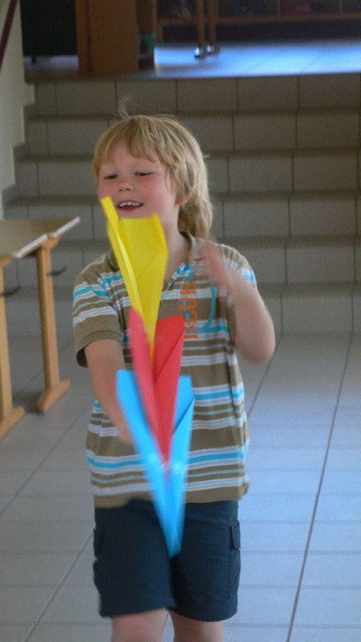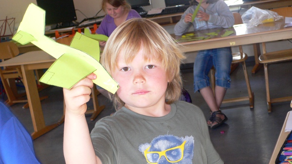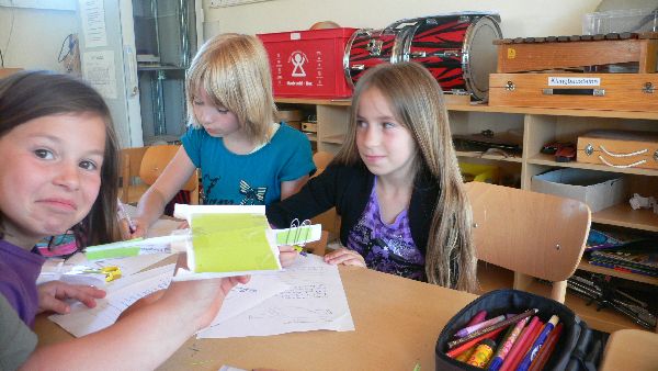 Zwei, die ihr Handwerk verstehen Donnerstag, der 25. Mai 2011Der 2-Cent-SeglerDie Tuning-Ideen werden immer ausgeklügelter. Auch die Flugobjekte sehen einem richtigen Flugzeug immer ähnlicher, und heute geht's an die Feinjustierung. Mit einem 2-Cent-Stück wird der Flieger vorne beschwert. So sollen optimale Flugeigenschaften erreicht werden. Die Kinder überlegen, wo das 2-Cent-Stück angebracht werden muss, um dieses Ziel zu erreichen. "Leider habe ich kein 2-Cent-Stück mit. Das brauchen wir aber, weil wir unseren Flieger vorne schwerer machen wollen. Hinter ist er ja schon schwer." Die beiden Mädchen überlegen, was sie stattdessen am Flieger anbringen können und vergleichen immer wieder das Gewicht. Einige Andere haben ihr Tuning bereits abgeschlossen und präsentieren stolz das Ergebnis.